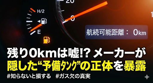 最近の車は、航続可能距離が「あと0km」と表示されても、実はそこからまだ数リットル残っている「バッファ(隠し在庫)」があります。これはスマホの電池が1%になっても、数分間は画面がついているのと同じ。「本当に最後の最後」までの予備なんです。