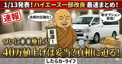 1/13急遽発表「ハイエースが一部改良されるらしいけど、何が変わったの?」 「価格が40万円も上がる?!、今のうちに現行型を買ったほうがいい?」