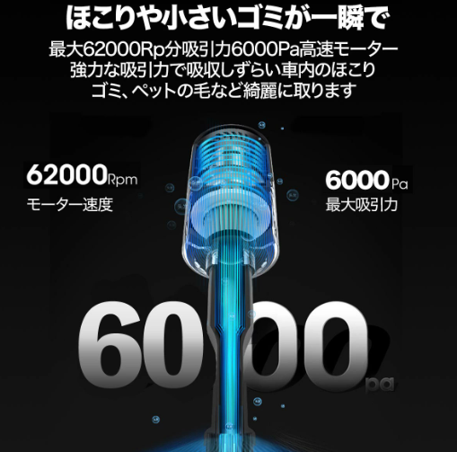 「こんなに軽くて、本当に吸うの?」と侮るべからず!120Wのパワフルなモーターが生み出す6000Paの強力な吸引力で、目に見えるゴミはもちろん、カーペットに絡みついたペットの毛や、目に見えないハウスダスト、ダニまでもしっかり吸引します。実際車って砂や小石、シートの間の埃や食べかすって中々取りにくくて、吸引力がないと結果意味ないんですよね。。
