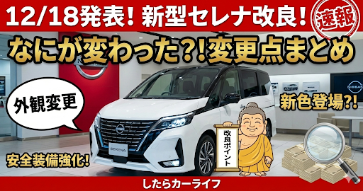 2025年12月18日、日産セレナの改良モデルが発表されました(発売は2026年2月中旬)。