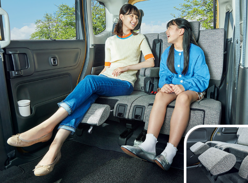 - マルチユースフラップ: これぞ新型スペーシアの目玉! 後席の座面の一部を引き出すと、足置き(オットマン)や荷物のストッパーになる超便利機能です。オットマン付きは本当に快適!!